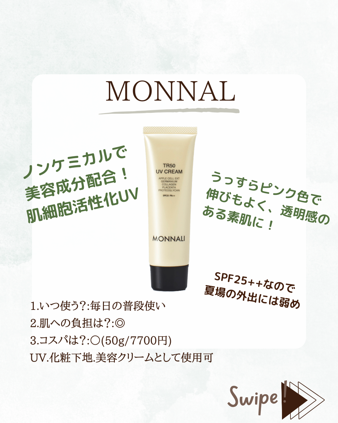 | 商品の特徴 | MONNALI TR50 UV CREAM モナリ 日焼け止め 2本セット モナリ 日焼け。モナリ 日焼け止めUVクリーム 2点セット 【公式通販】。TR50 UVクリーム | MONNALI。モナリ MONNALI ゴールドシリーズ TR50 UVクリーム SPF25 PA++ 50g 日焼け止めTR50 UV CREAM50g / 7,700円私は戦う。 お肌の天敵である紫外線と。 毎日長時間使用するものだからこそ、お肌への優しさを忘れてはいけません。 それはまるで一日中、お肌にパックしているような気持ち良さ。 有効成分とSPF25 ++を武器に、私は紫外線と戦います。成分水、シクロペンタシロキサン、BG、ジエチルヘキサン酸ネオペンチルグリコール、PEG-10ジメチコン、ジメチコン、ソルビトール、ペンチレングリコール、リンゴ果実培養細胞エキス、カッパフィカスアルバレジエキス、水溶性プロテオグリカン、プラセンタエキス、エチルヘキシルグリセリン、オリゴペプチド-34、加水分解コラーゲン、PEG-9ジメチコン、イソステアリン酸フィトステリル、レパゲルマニウム、スクワラン、硫酸Mg、ステアリン酸、(ジメチコン/メチコン)コポリマー、海水、メチコン、ジステアルジモニウムヘクトライト、キサンタンガム、セスキイソステアリン酸ソルビタン、レシチン、グリセリン、クエン酸Na、トコフェロール、フェノキシエタノール、酸化亜鉛、酸化チタン、タルク、水酸化AI、マイカ、酸化鉄・組み合わせのご相談はお気軽にください♡・他に何品か出品している商品との組み合わせも可能です#MONNALI#クレンジング#モナリ#TR50エッセンス#ミハツ#MIHATSU#TR50#BLACKブラックシリーズ#シャンプー#トリートメント#育毛剤#GROW#ピーリングジェル。TR50 UV CREAM SPF25 PA+ 2個 楽天市場】モナリ ゴールドシリーズ TR50。ひやけどめ。みーさん専用 CHANEL日焼け止め乳液 サブリマージュプロテクシオンUV50。ビーバンジョア 薬用 UV美白エッセンシャルベース52ml×2本セット【正規品】。ゼオスキンへルス BSサンスクリーンSPF50 | ||