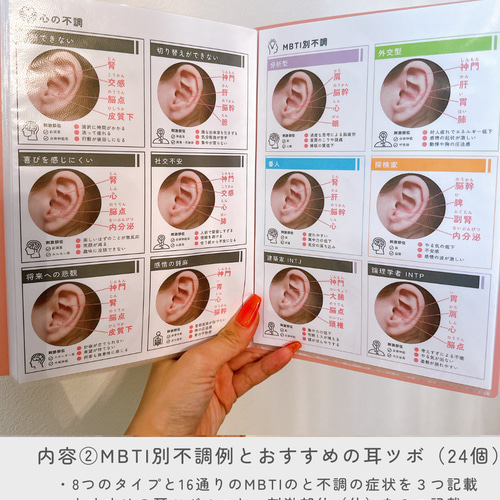 | 商品の特徴 | 耳ツボジュエリー | 耳つぼ症状辞典 | 耳ツボ辞典 イヤリング。耳ツボジュエリー | 耳つぼハンドブック | 耳つぼ辞典 | - メルカリ。耳ツボジュエリー | 耳つぼハンドブック | 耳つぼ辞典 | - メルカリ。耳つぼ症状辞×耳つぼ施術ハンドブックセット【耳つぼ症状辞典】セラピストさんのお守りに♡“見たい・知りたい”が大容量ボリュームな1冊に!〈掲載内容〉全38ページ・部位別不調 180例 症状/おすすめのツボ紹介・MBTI別不調 24例・耳の形の種類とポイント・耳の形の種類とポイント・耳つぼと体の各部位の関係・耳つぼ左右の違い・右耳のつぼの特・左耳のつぼの特徴徴・交感神経と副交感神経の働きの違い・耳ツボと五臓六腑今回は体や不調別に症例をまとめた1冊になっております!【耳ツボ施術ハンドブック】施術現場でよくある疑問やお悩みにもしっかり対応!はじめての方も、復習したい方にもおすすめです。◾️ハンドブックvol.1 記載内容・耳ツボジュエリー施術・耳ツボとジュエリーの関係性・耳ツボジュエリーを貼らない方がいい人・体調に応じて貼らない判断をする・耳ツボジュエリーと交感神経・耳ツボジュエリーと副交感神経・ツボの探し方とジュエリー貼付位置の確認・ツボを押しても痛いと感じない場合・ぽかぽか巡る、耳ほぐしの方法・耳ツボジュエリーの貼り方と注意点・シールを貼る時のポイント・貼る位置の注意点・長持ちするシールの貼り方(位置)・汗をかく時期の注意点・寒い季節の注意点・耳ツボジュエリーを貼る期間・6日以上貼り続けた場合のデメリット・貼る個数の注意点◾️ハンドブックvol.2 記載内容・施術後のケア方法(皮膚について)・施術後のケア方法(耳全体)・施術後のケア方法(注意点)・耳ツボジュエリーが取れやすい生活シーン・耳ツボジュエリーの種類と選び方・耳ツボジュエリーの保管方法・触れるべきでない部分(痛点・炎症部位など)・何歳くらいから施術可能か・トラブル時の対処法(痛み・赤みが出た等)・春の季節におすすめの耳ツボ・夏の季節におすすめの耳ツボ・秋の季節におすすめの耳ツボ・冬の季節におすすめの耳ツボ・デスクワークが多い仕事の方向け・外仕事が多い仕事の方向け・立ち仕事が多い仕事の方向け・産後の方向け☺︎ mimy耳つぼ辞典シリーズとの併用で、施術の幅・信頼感・提案力がぐっとアップ!。耳ツボジュエリー | 耳つぼ症状辞典 | 耳つぼ施術ハンドブックセット | ||