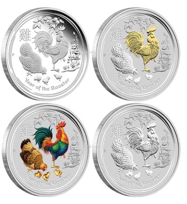 ☆。ブリスターパック入「オーストラリア 鶏図記念・2017」。 Australia 2017 Year of Rooster Lunar 1 Oz 4 Coin Type Set $1